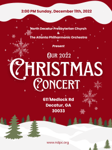 Bring family, friends, and neighbors to NDPC’s annual Christmas Concert featuring the NDPC Community Choir singing alongside our orchestra-in-residence, the Atlanta Philharmonic Orchestra! The concert